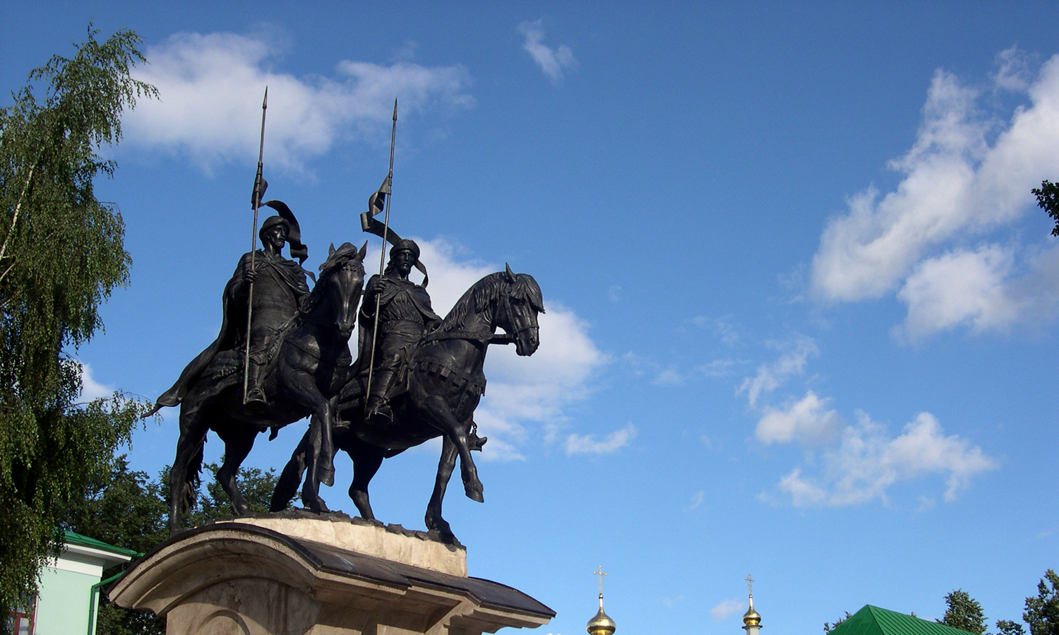 Памятник Борису и Глебу у стен Борисоглебского монастыря в Дмитрове (2006 год, скульптор — А. Ю. Рукавишников)